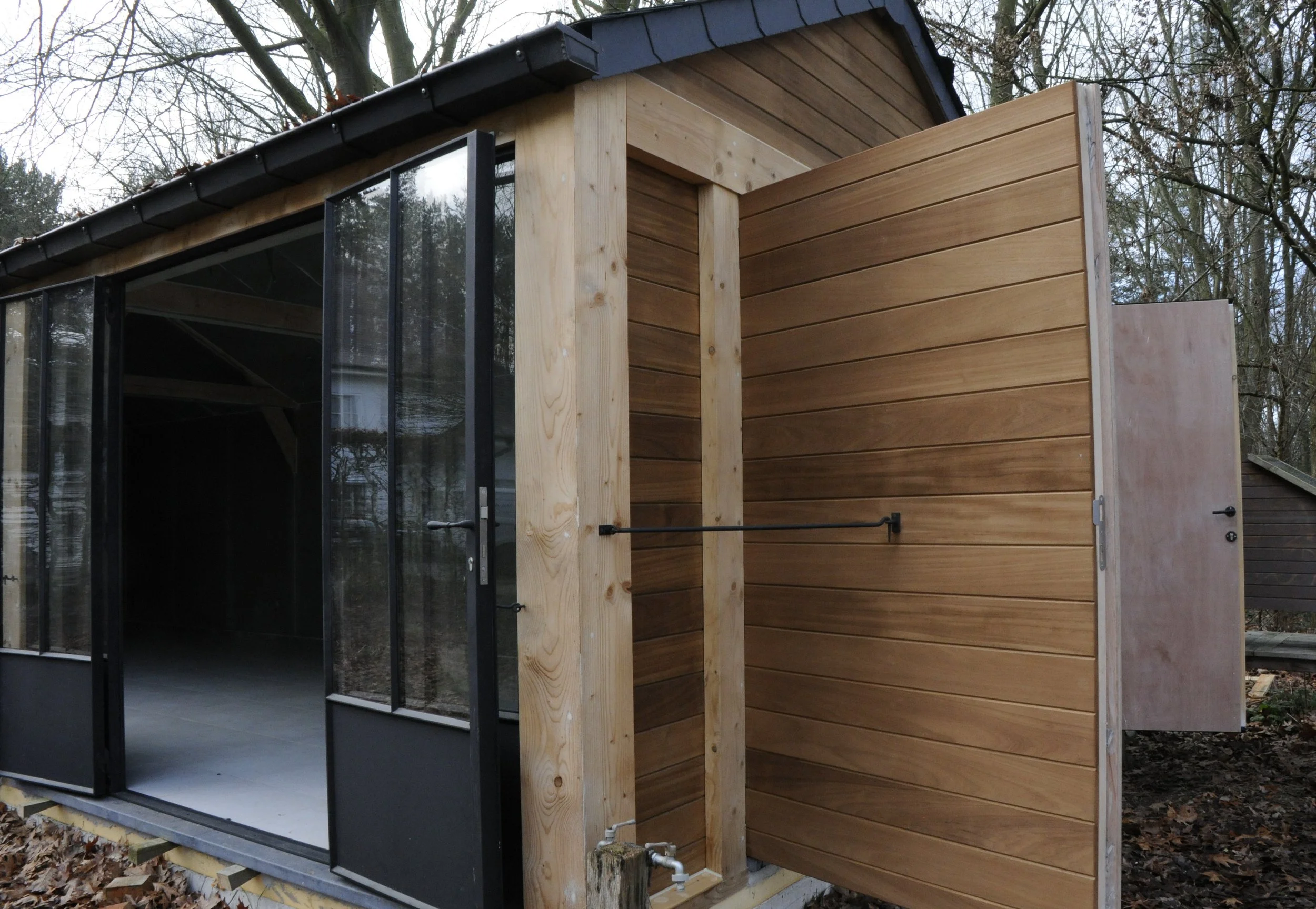 Op basis van de architectplannen en in nauw overleg met de bouwheer werkte Teken en Maak dit ruime tuinhuis (4 x 10 meter) technisch verder uit. Wij realiseerden dit op een domein te Betekom in kleurloos gedrenkt vurenhout voor de constructie-elementen en thermowood (ayous) voor de horizontale gevellatten.