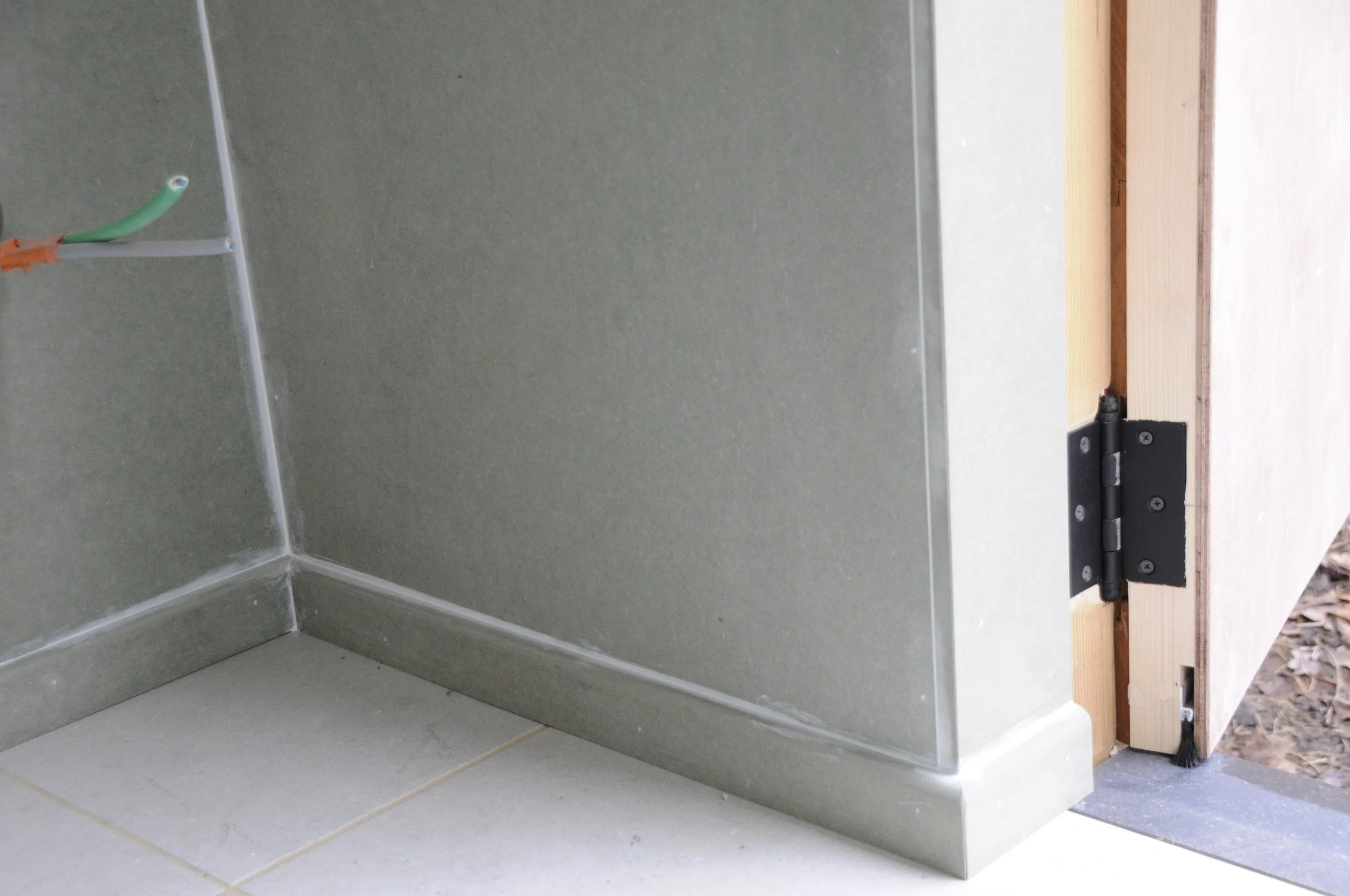 Het tuinhuis werd volledig geïsoleerd met vlaswol, een natuurlijk isolatiemateriaal. Voor het onderdak gebruikten we OSB-panelen en voor de binnenafwerking (schilderklaar opgeleverd) waterwerende MDF-platen.