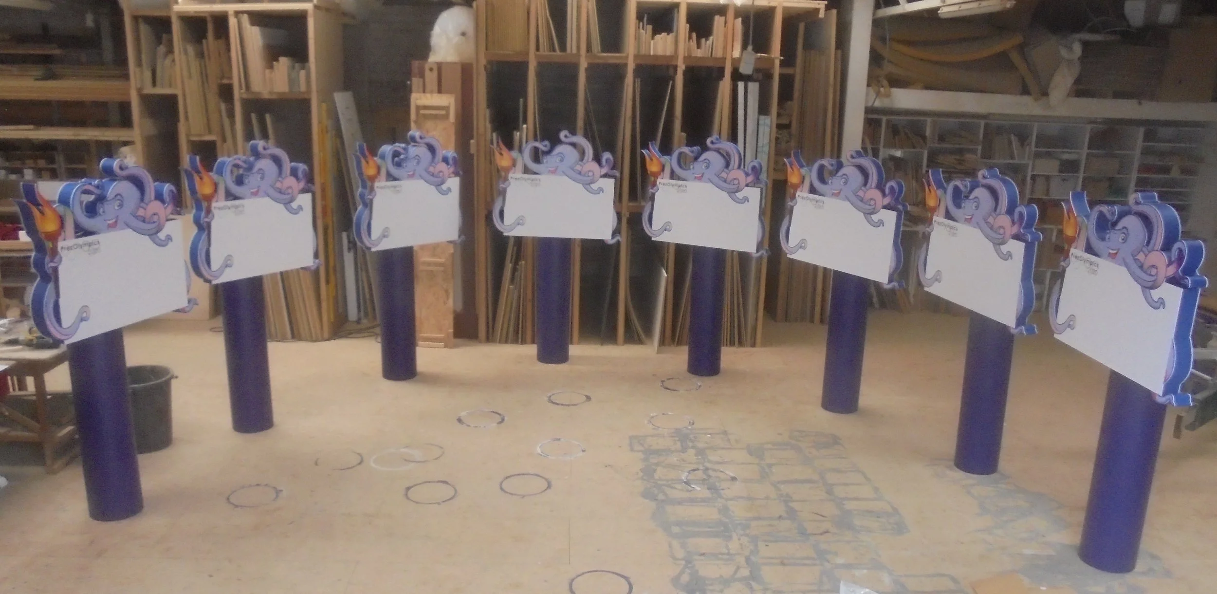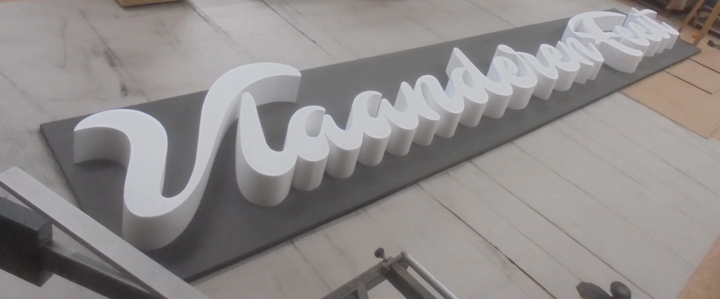 Regelmatig voeren wij van deze stukken de plaatsing uit (bijvoorbeeld 3D-teksten op een muur) of leveren wij bijkomende decoronderdelen op maat (zoals de achterplaat van een logo, ophangsystemen, steunen in gelakt hout, staal of plexi,…)